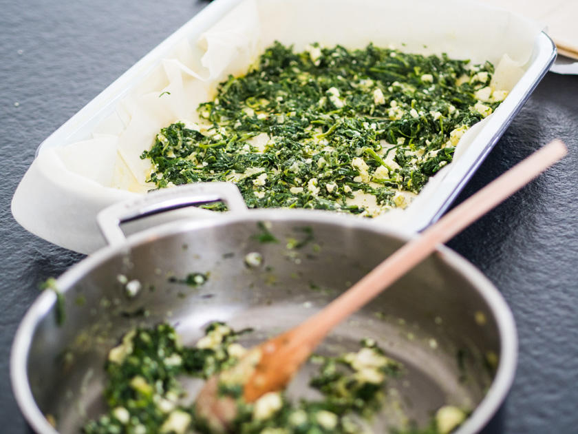 - Danach Feta zur Spinatmasse hinzufügen, einmal durchmischen, kräftig mit Salz, Pfeffer und einer Prise frisch geriebenem Muskat würzen und schon kann man sich ans Schichten machen.