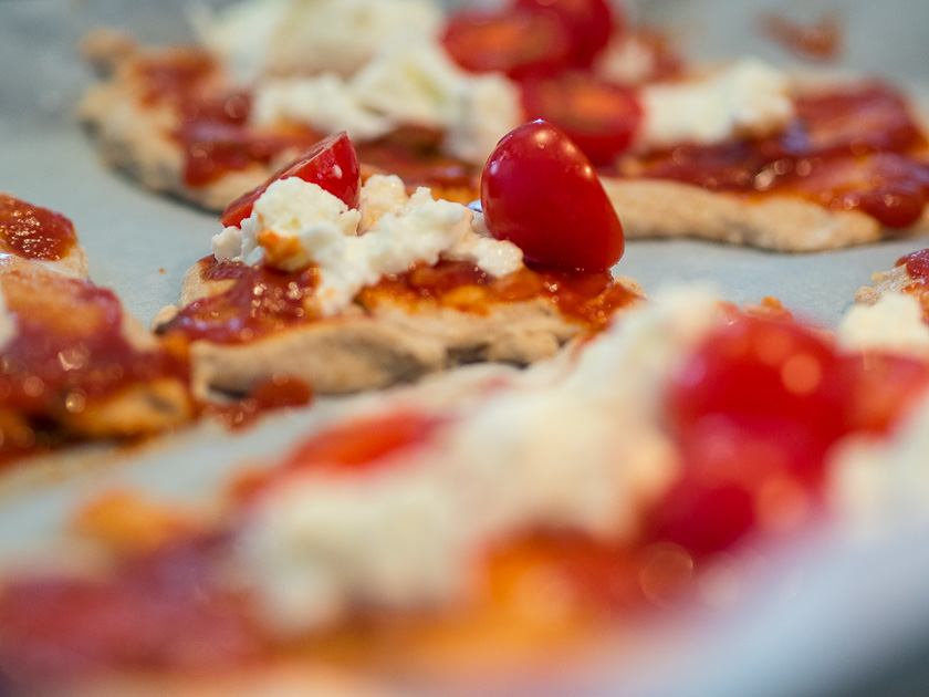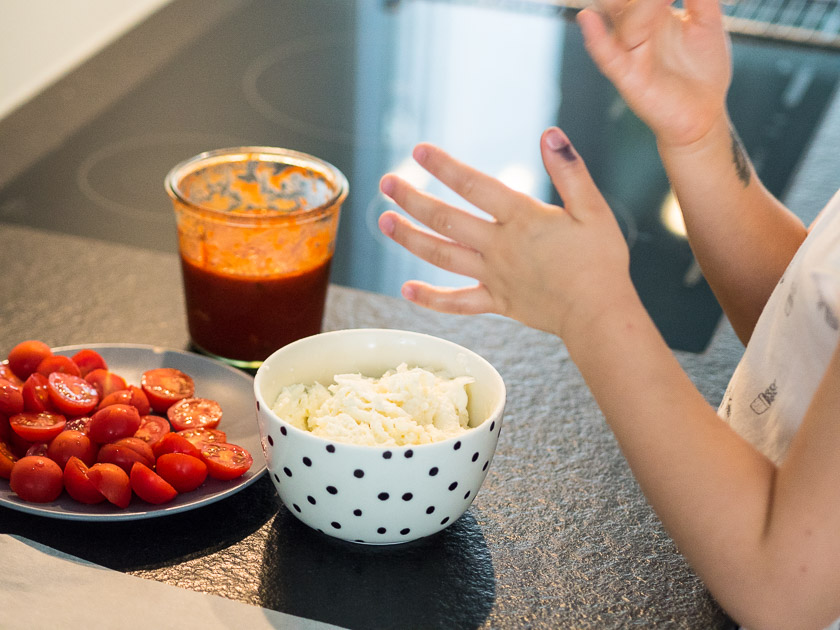 - 2x Backpapier auf Küchenarbeitsplatte auflegen, etwas Mehl darauf stäuben und aus dem Teig mit etwas Mehl direkt auf dem Backpapier kleine Pizzen formen, mit Tomatensoße bestreichen und Mozzarella belegen, salzen & pfeffern. Auf das Backblech im Ofen legen.