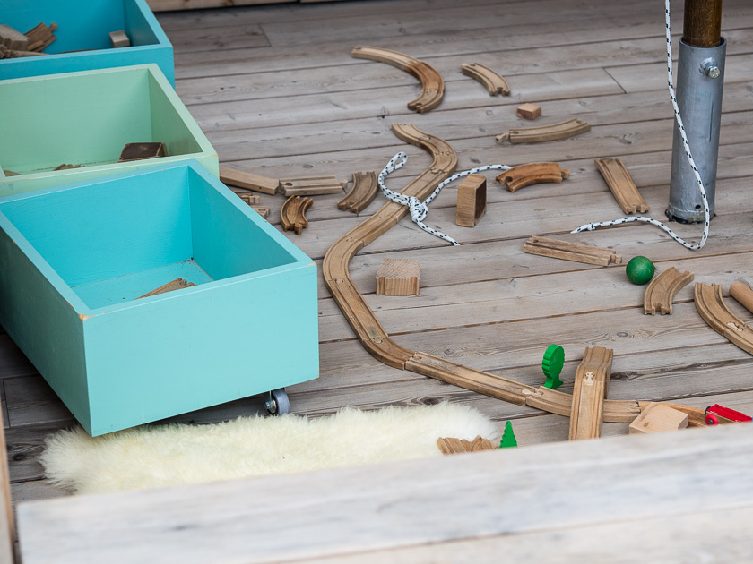 Betritt man das Hotel, werden die Kinder gleich von einer Spielecke aus Holz und mit Tafellackwänden zum Malen begrüßt. Auf der Terrasse befindet sich eine kleine Eisenbahn Arena mit Podest, auf dem die Kleinsten sich austoben können, während Mama & Papa an ihrem Moscow Mule Drink nippen.