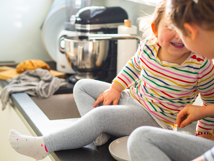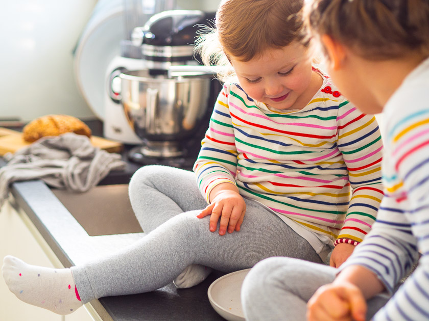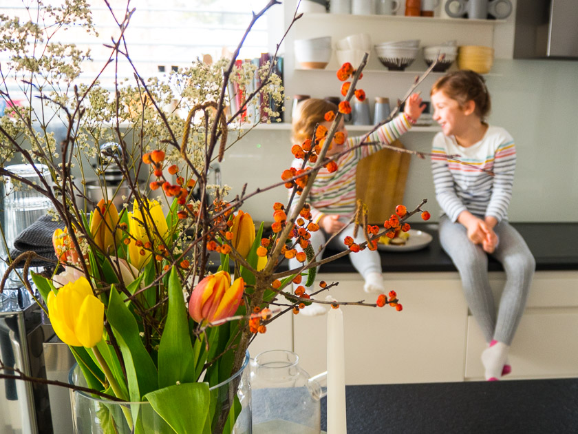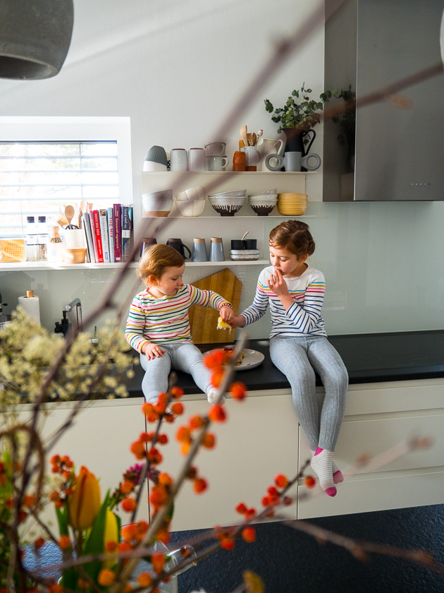 Auf der Küchenarbeitsplatte liegen nicht nur Messer und stehen Töpfe, da werden Elternbriefe unterschrieben, beim Steh-Espresso mit dem Mann Urlaubspläne geschmiedet, da wird der Gang zwischen Arbeitsblock und Abwasch schon mal in eine Theaterbühne mit zwei verkleideten Schmetterlingen umgewandelt. Hier werden nicht nur Frühlingszwiebel in feine Ringe geschnitten, sondern auch blaue Knie mit Kühlbeuteln versorgt, erdiges Gemüse aus dem Garten gewaschen und lila-pinke Schmuckkörbchen in verschiedenen Glasvasen arrangiert. Da krabbeln Käfer und stapeln sich manchmal Wasserfarben-Aquarelle, da warten Pakete auf’s Auspacken und wird das Risotto in den Ofen geschoben.
