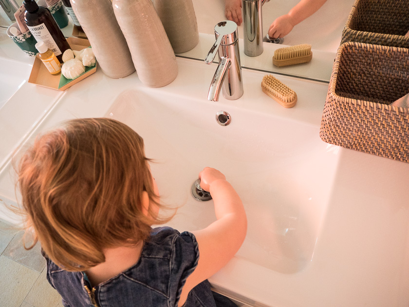 - Tipp 8: Sonst steht bei uns im Bad außerhalb der Schränke nur rum, was wir auch tatsächlich täglich brauchen – flüssige Handseife, Bürsten, Zahnbürsten, Duschgel und ein Korb (das ist eigentlich ein Abwaschkorb von Ikea mit Abtropfmöglichkeit für die Küche) mit Badewannenspielzeug.