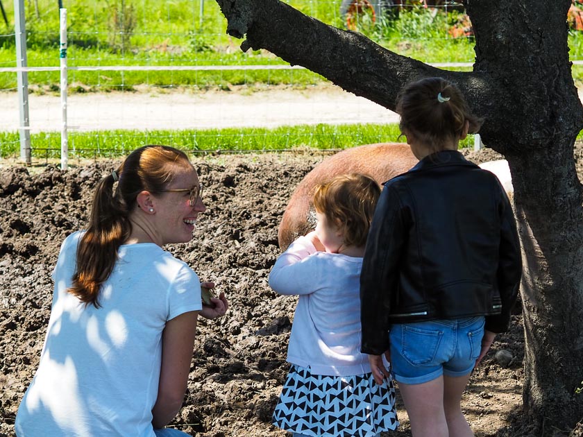 Danach müssen wir unbedingt zu den Schweinen. Ich weiß nicht, wer aufgeregter ist über den Besuch – die rotbraunen und gefleckten Duroc Schweine oder unsere Mädels. Die Schweine hinter dem Hof der Gottschuly-Grassls jedenfalls galoppieren vergnügt in ihrer Suhle herum und die Kinder hinterher. Sieht man den Schweinen da unter den schattigen Bäumen so zu, möchte man doch glatt mit ihnen tauschen.