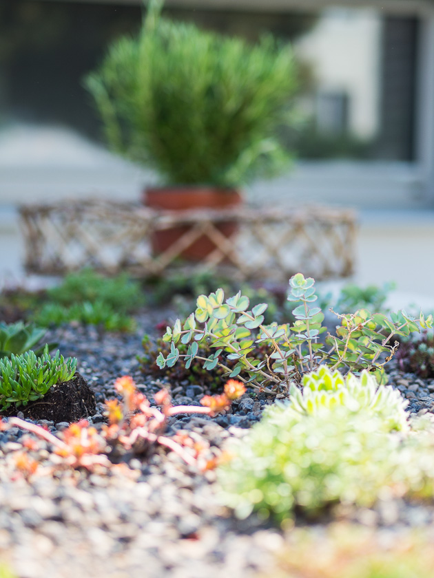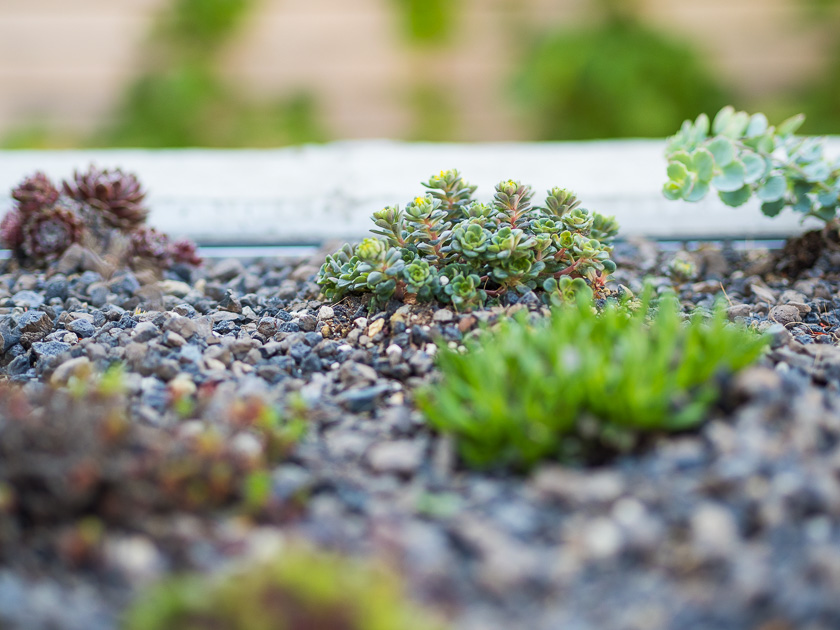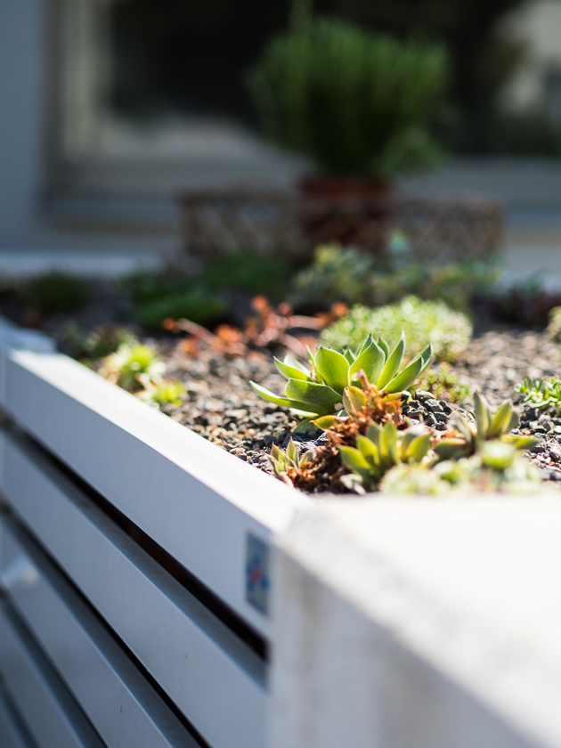 Der perfekt eingepasste Pflanzentrog wurde mit Dränagematerial gefüllt und anschließend in einem Gemeinschaftsprojekt vom Mann und mir mit verschiedenen Arten von Sukkulenten bepflanzt. Die sind anspruchslos, brauchen kaum Wasser und blühen auch noch hübsch.
