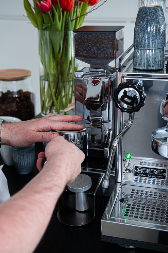 Einige Zeit dauert es auch bis man das mit dem perfekten Tampern drauf hat. Also die richtige Menge an Kaffeepulver in den Siebträger mahlen, dabei das Pulver gleichmäßig im Sieb verteilen und mit ausreichend Kraftaufwand den Tamper (Stempels) in den gemahlenen Kaffee pressen.