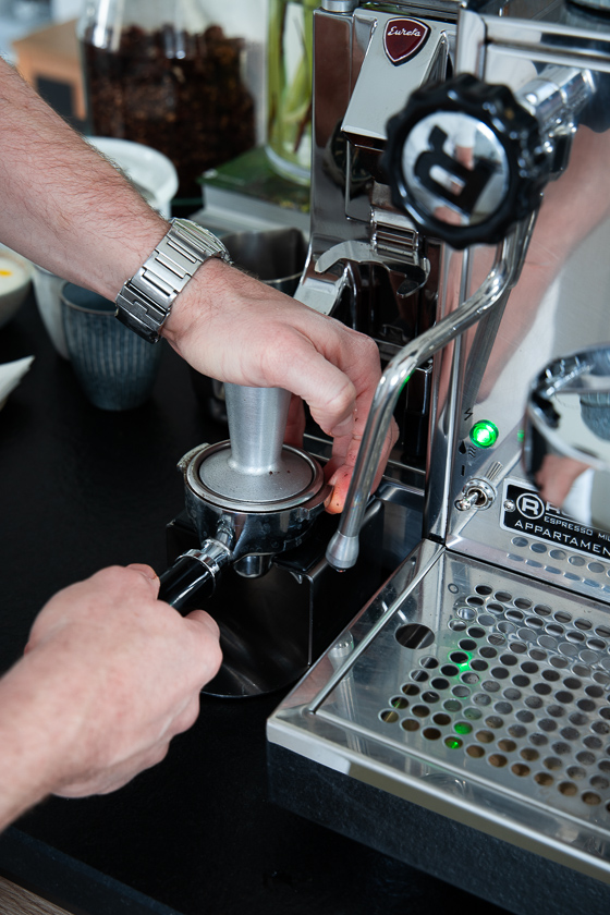 - Tamper und Tamping Station zum Festpressen des Kaffeepulvers im Siebträger