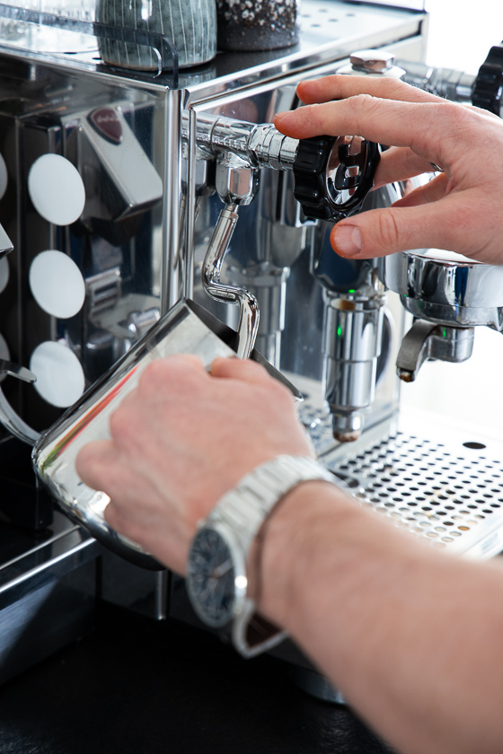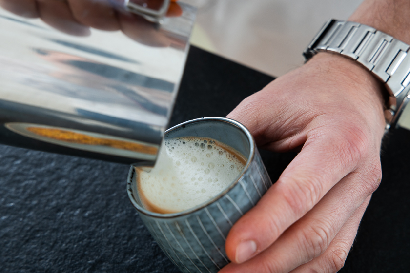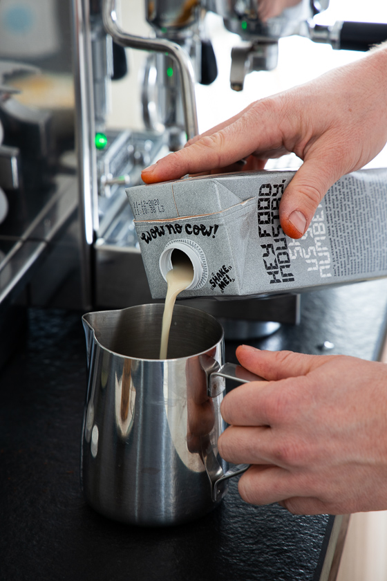- Milchkännchen, in dem die Milch aufgeschäumt wird – die Hafermilch Barista von Oatly schmeckt uns am besten