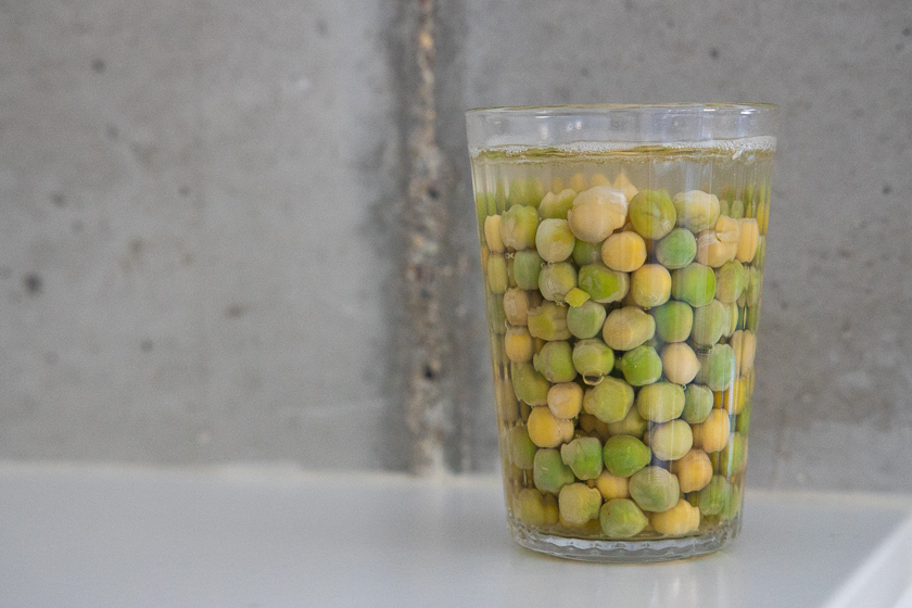 - Dann werden die Erbsen über Nacht in einem Glas Wasser eingeweicht, am nächsten Tag abgeseiht, durchgespült und gleichmäßig auf der Erde verteilt.