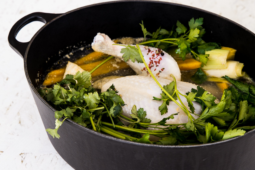 Für die Gemüsevariante lässt du das Huhn weg und nimmst stattdessen insgesamt 1,5 kg Suppengemüse.