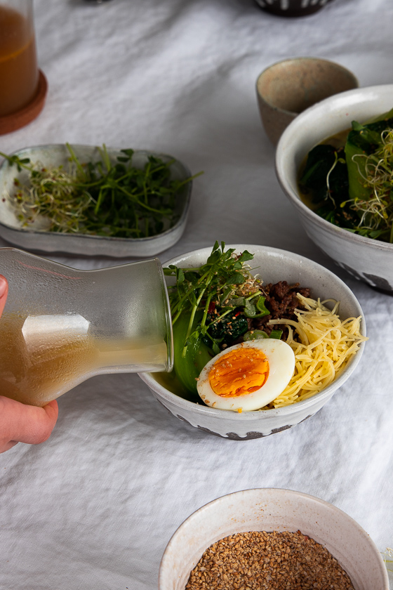 Ist die Brühe fertig, kann man mit der Fadelnudel-RAMEN-Suppe loslegen – die Brühe koche immer am Vortag.