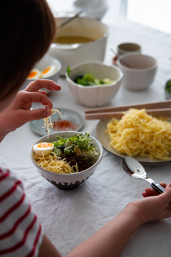 Die japanische Nudelsuppe RAMEN ist nach ihrer Nudeleinlage benannt. Ich ersetze die japanische Nudel einfach durch einen österreichischen Suppennudel-Klassiker – die Fadennudel. So geht man auf Nummer Sicher, dass die Suppen Groß & Klein gleichermaßen schmeckt.