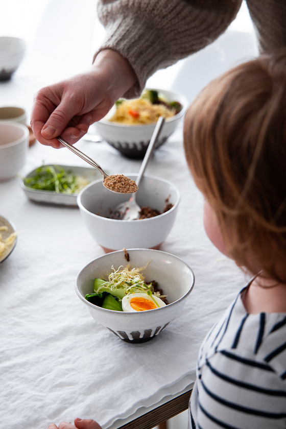 - Suppentopf, Eier und abgeseihte Nudeln auf einem Teller gemeinsam mit den Erbsen-Sprossen und Radieschen-Keimlingen sowie Gomasio und Chili zu den restlichen Einlagen auf den Tisch stellen.