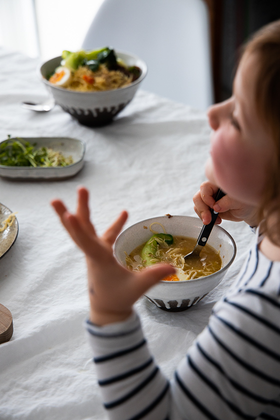 Das optimale Essen mit Kindern ist die Suppe sowieso. Jedes Kind bekommt seine Schale mit sämiger Hühner- oder Gemüsebrühe und füllt sich an Einlagen rein, was es mag. Fadennudeln waren bei uns übrigens ein Fixstarter. Der Pak Choi ist nicht so gut angekommen, der Blattspinat hat den Kindern besser geschmeckt.