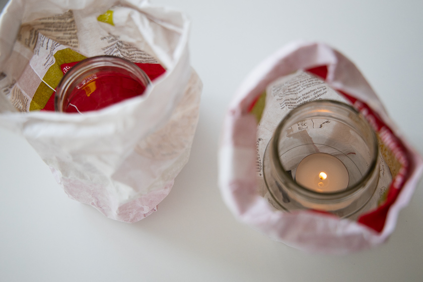 Die Papierverpackung der Recheis Bio-Fadennudeln aus 100% Cellulose wird während die Nudeln kochen ruck zuck upgecycelt – zum Entsorgen im Altpapier ist sie mir zu schade. Ich stülpe die Papierverpackung einmal um, damit die weiße Innenseite außen liegt. Der obere Papierrand wird 2-3 Mal umgekrempelt und am Ende nochmals nach innen geschlagen – dadurch hat man einen weißen hübschen Rand. Nun ein Teelicht in einem alten, großen Marmeladeglas in die Papiertüte stellen und die Kerze anzünden – die brennende Kerze nie ohne Aufsicht lassen! Durch das rote, innenliegende Papier erhält man eine stimmungsvolle Beleuchtung. Ich sammle schon mal fleißig Recheis-Nudel-Verpackungen für romantische Abende auf unserer Terrasse. Oder du stellst einen Kräutertopf in die Papiertüte. Sieht auch richtig hübsch aus in der Küche!
