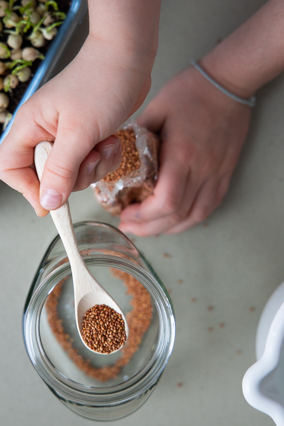 - Auch die Radieschen-Saat wird über Nacht eingeweicht, am nächsten Tag durchgespült und in das Sprossenglas gepackt.