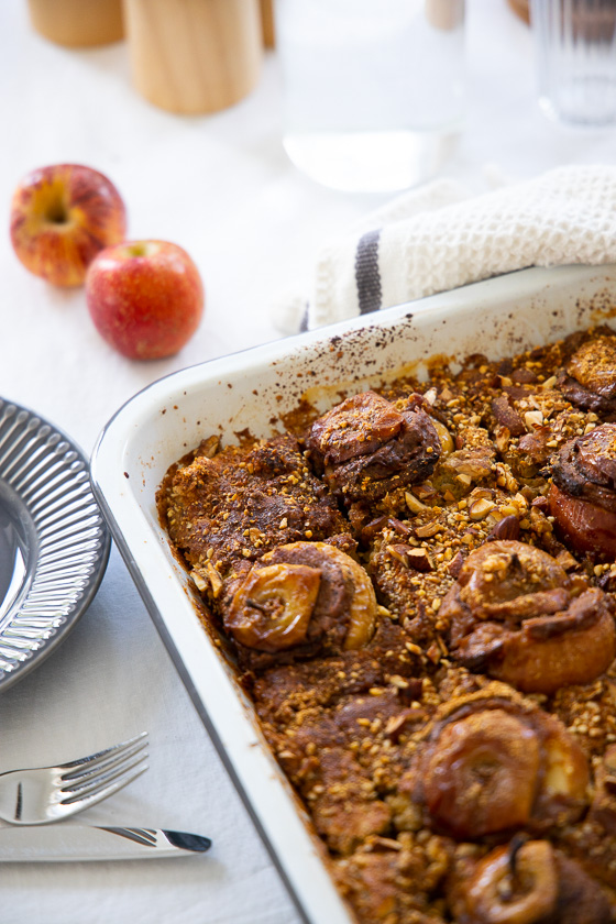 Bratäpfel tauchen in KORNelia Einkornreis-Auflauf