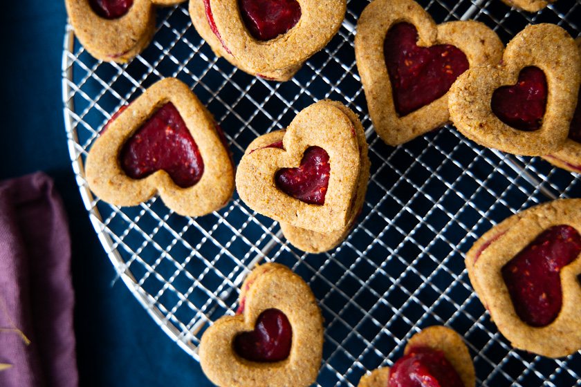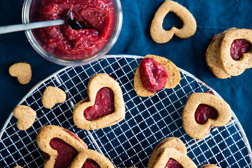 - Sind die Herzen abgekühlt, die ganzen Herzen mit etwas Himbeer-Chia-Marmelade bestreichen und die Herzen mit dem ausgestochenen, kleinen Herzen darauf setzen.