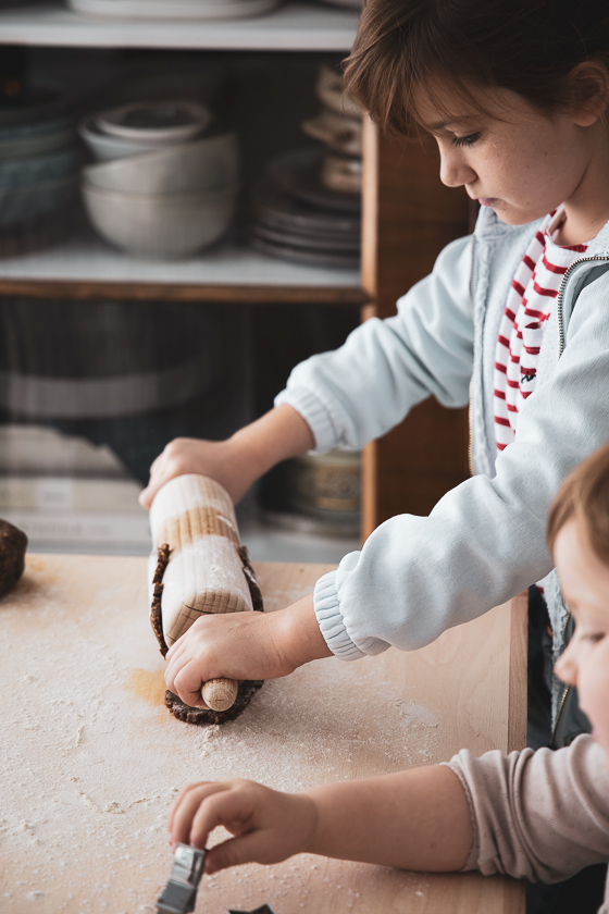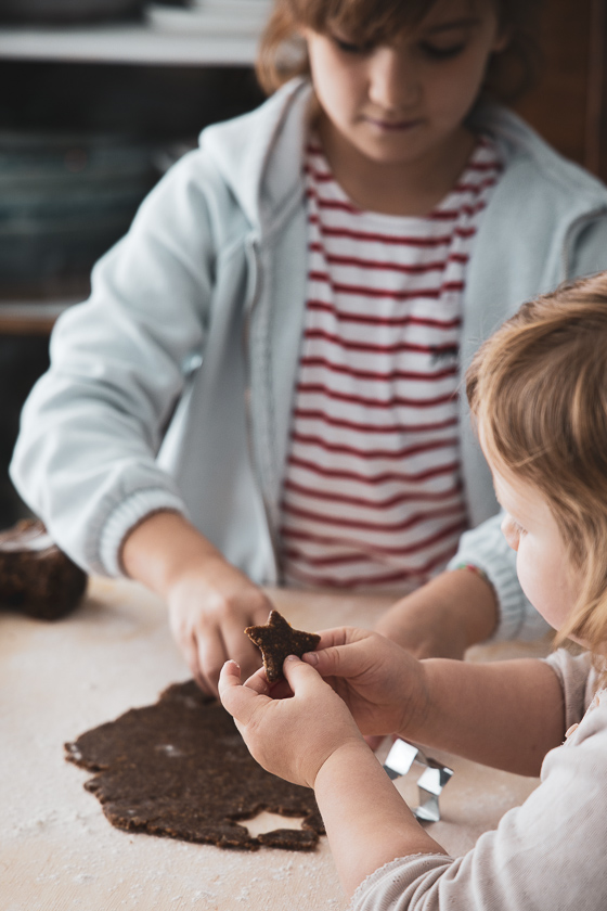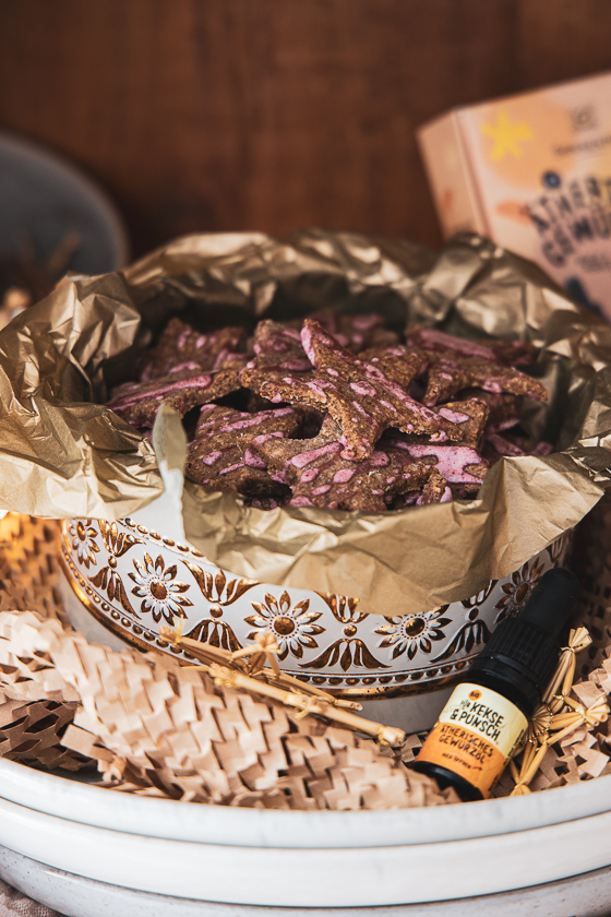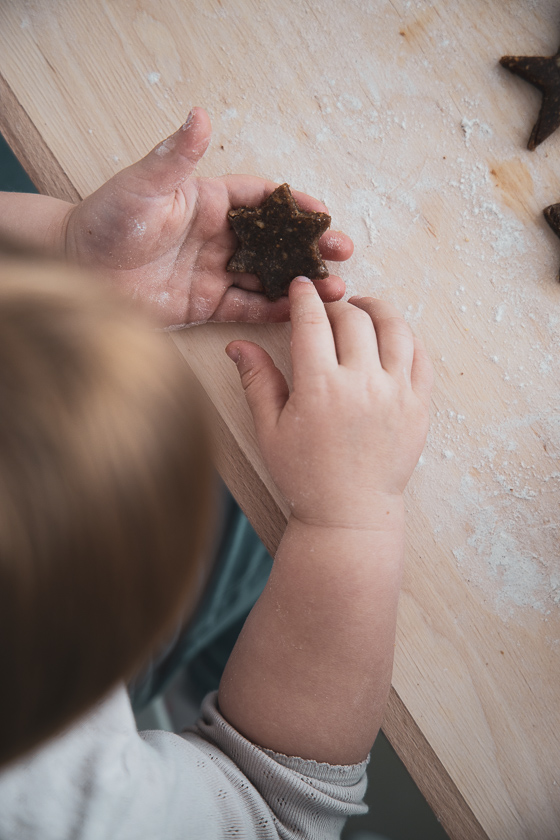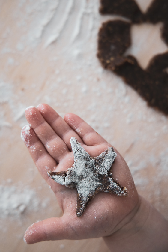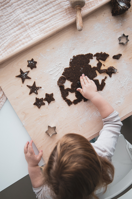 Während der Massage kann man jedenfalls gleich für das Ausstechen der Kinder-Punsch-Sterne üben. Der Haselnuss-Teig, gewürzt mit Zimt, Keks- und Punsch Gewürzöl und Kokosblütenzucker lässt sich von kleinen Händen fabelhaft verarbeiten . Zum Ausrollen verwenden wir Buchweizenmehl, damit auch Familien, die auf Gluten verzichten müssen, zum Weihnachtskeksgenuss kommen.