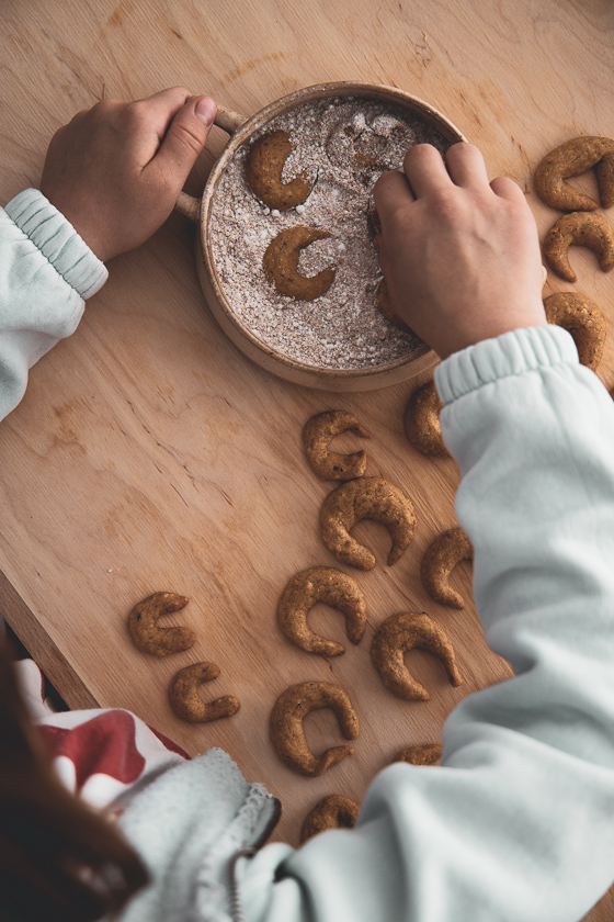 Bei uns allen hier waren die Tonka-Kipferl der absolute Renner. Zum Glück hatte ich aufgrund eines Tricks gleich mehr hergestellt. Die Mädels haben den Teig nach der altbekannten „Wuzelmethode“ zwischen den Handflächen zu kleinen Rollen geformt und diese anschließend zu Kipferln gebogen.