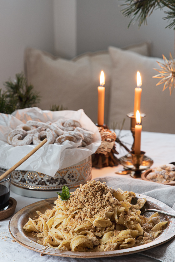 Sollte du es überraschenderweise nicht schaffen alle Tonka-Kipferl oder auch Vanillekipferl aufzuessen, dann lege ich dir meine Vanillekipferl-Brösel Nudeln ans Herz. Absolutes Soulfood – genau wie die Maroni-Pekannuss-Bröselnudeln.
