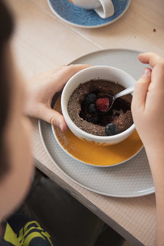 Ein Löffelchen Schokokuchen, der in Frühstück-Teetassen gebacken wird.
