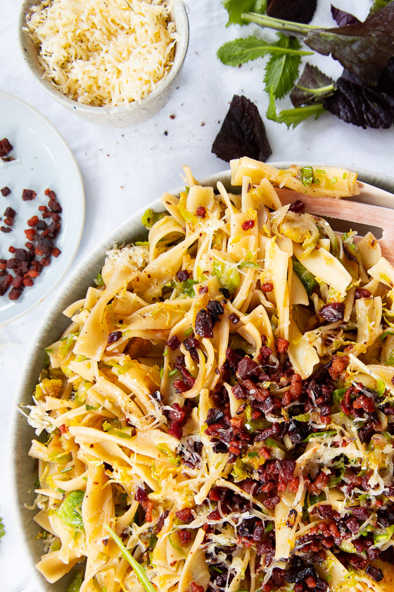 Mangalitzer Schweinespeck kommt auch oft mit in den Stoffbeutel. Kohlsprossen, wenn angeboten, oder ich nehme sie im Hofladen am Heimweg vom Markt noch mit. Oben drüber noch fein geriebenen, etwas gereiften Ziegenkäse und das schnelle Mittagessen steht mit dampfend heißen Bio-Bandnudeln von Recheis auf dem Familienesstisch.