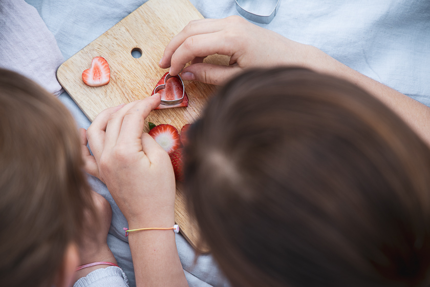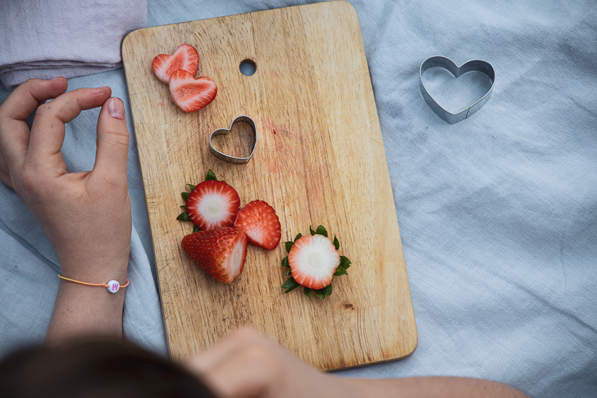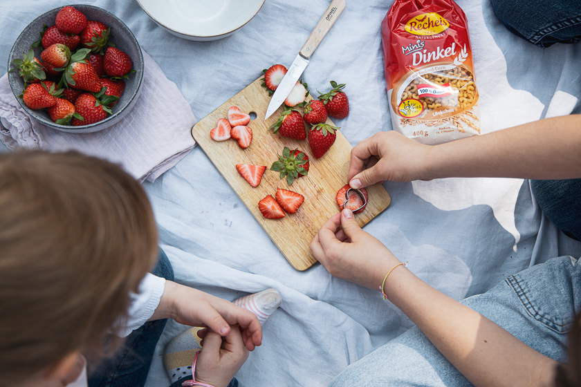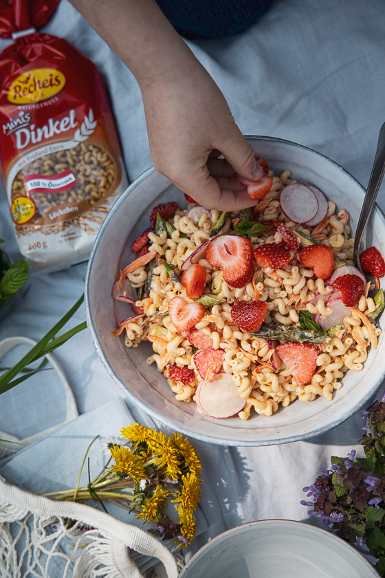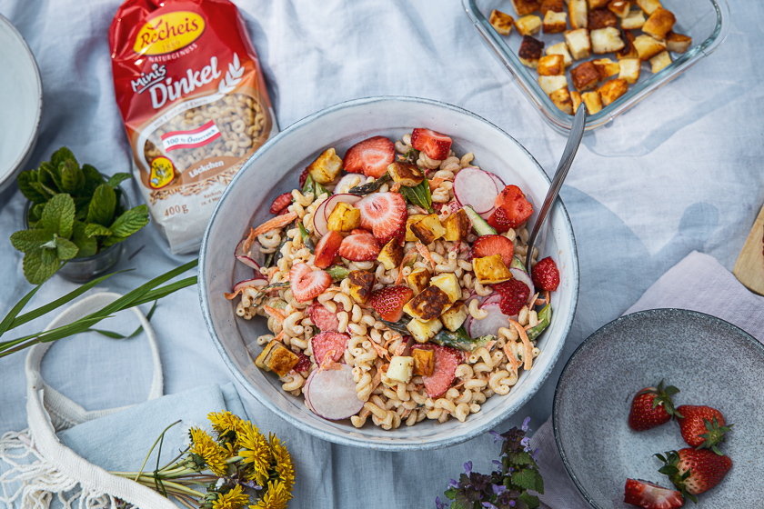 Mein Nudelsalat mit den Dinkel Löckchen von Recheis ist genauso unperfekt perfekt von deinen Lieben zubereitbar. Je inbrünstiger aus dem Erdbeerscheiben oder einfach mal ganzen Erdbeeren Herzen mit Keksausstechern ausgestochen oder mit dem Messer geschnitzt werden, umso besser schmeckt er. Nudeln, buntes Gemüse und Erdbeerherzen werden sanft ummantelt von cremigem Apfelminze-Mandelmus und die würzig-krossen Halloumiwürfel bilden die perfekte Einfachheit. Das Gefühl der nicht vorhandenen Nudelsalatschwere lässt einem immer wieder nachfassen. Die simpelsten Gerichte sind immer die Besten. Ein Salat, der mit Unterstützung von den Papas ganz easy von kleinen Händen geschnippelt und gerührt werden kann.