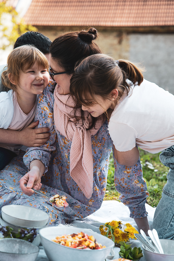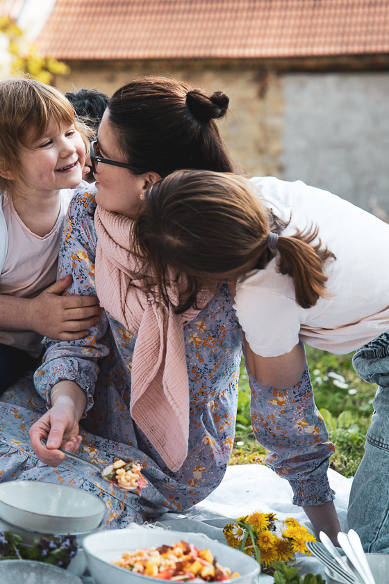 Draußen essen macht mich immer glücklich – auch eines der Dinge, die ich lieben gelernt habe in den vergangenen Monaten. Essen mit ein paar Schüsseln und Besteck in den Rucksack mit der Picknickdecke packen und im Grünen essen…wenn’s schon mit dem Heurigen- oder Restaurantbesuch mit Freunden nicht klappt. Dazu vielleicht zur Feier des Muttertages ein Glas prickelnd-eiskalten Rosé und da ist er dieser 30 Prozent Glücksmomente….nein, die 80 Prozent! Ja, genau da ist es das Glück Mama zu sein! Lasst es uns einfangen und schmiegen wir uns ganz fest daran!