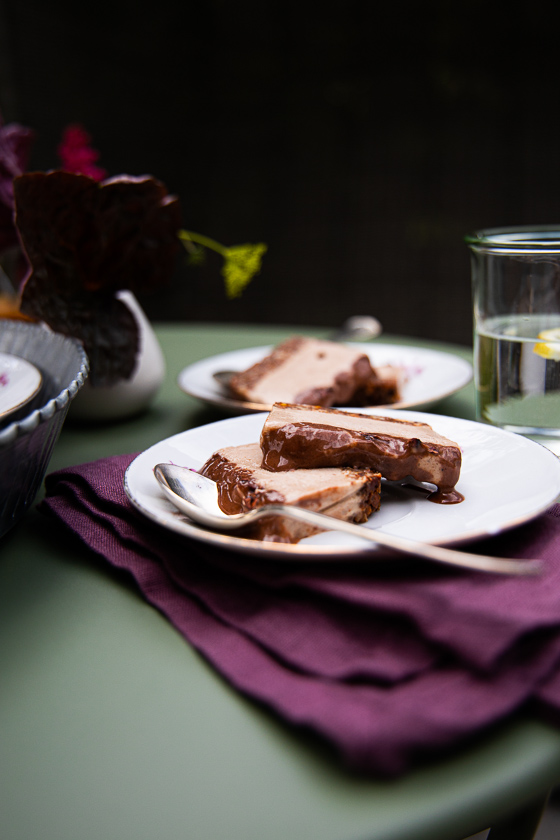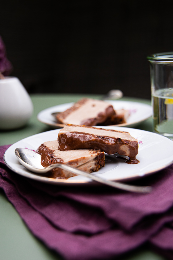 10-15 Minuten vor dem Genießen aus dem TK nehmen, damit man die Schnitte einfacher kopfüber aus der Form stürzen kann. Backpapier abziehen und mit einem großen, scharfen Messer (z.B. Brotmesser) in 1 cm dicke Scheiben schneiden. Isst man die Schnitten nicht komplett auf, kann man den Rest wieder zurück in die Glasform geben und wieder in den TK stellen.