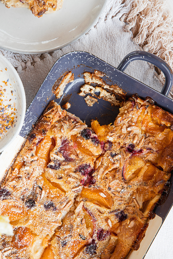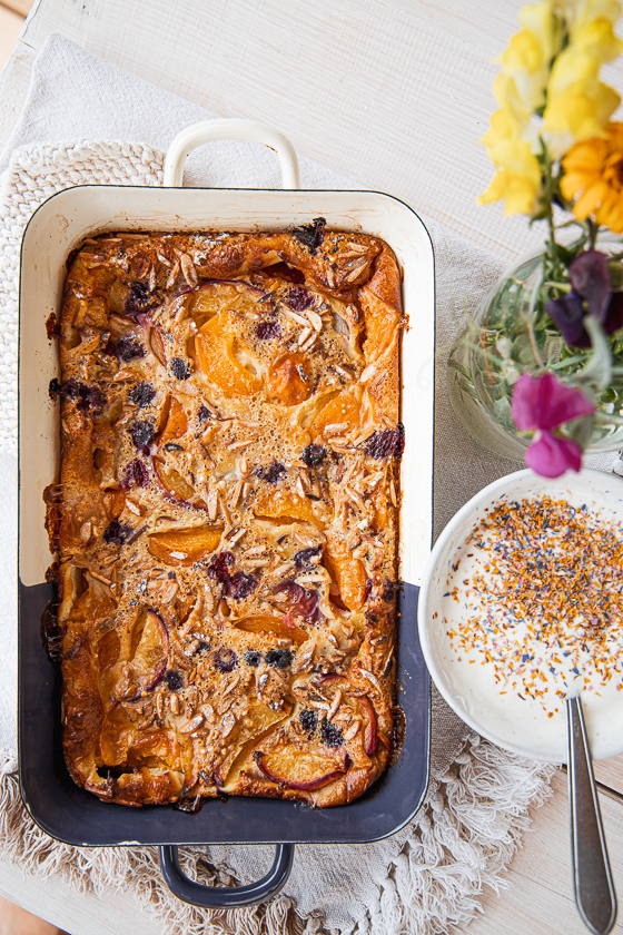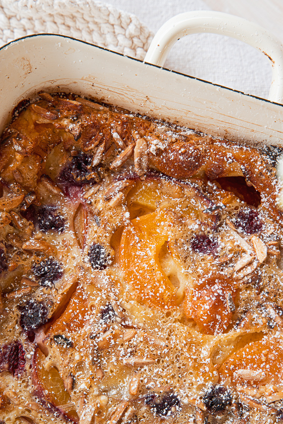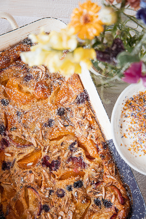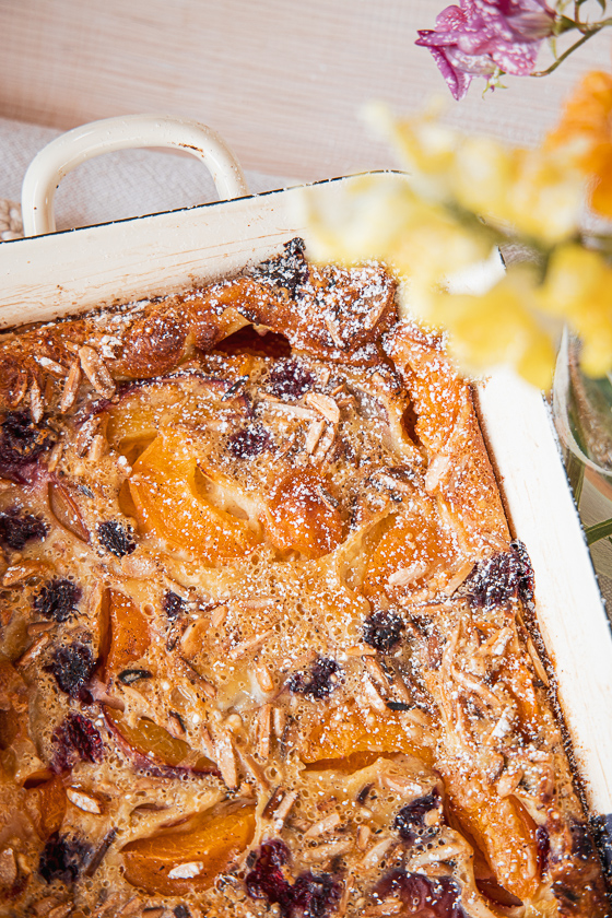 Sommer Clafoutis mit Marillen, Pfirsichen und Himbeeren