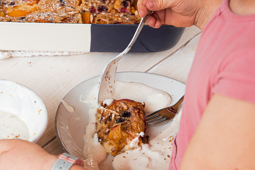 An Früchten kann man im Sommer beinahe alles verwenden. Ich konnte mich beim reichlichen Angebot gerade auch nicht entscheiden und habe daher Marillen, Pfirsiche und ein paar Himbeeren verwendet. Mit Heidelbeeren (Blaubeeren), Erdbeeren, nur Himbeeren, Nektarinen, Zwetschgen (Pflaumen) oder selbst Ribiseln (rote Johannisbeeren) schmeckt der Auflauf auch herrlich. Super ist immer eine Mischung aus säuerlichen und süßen Früchten.