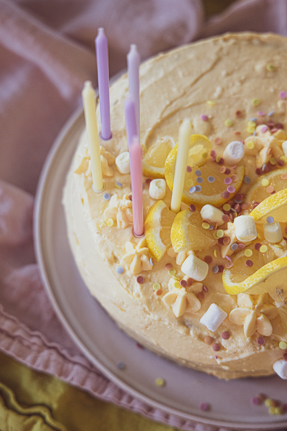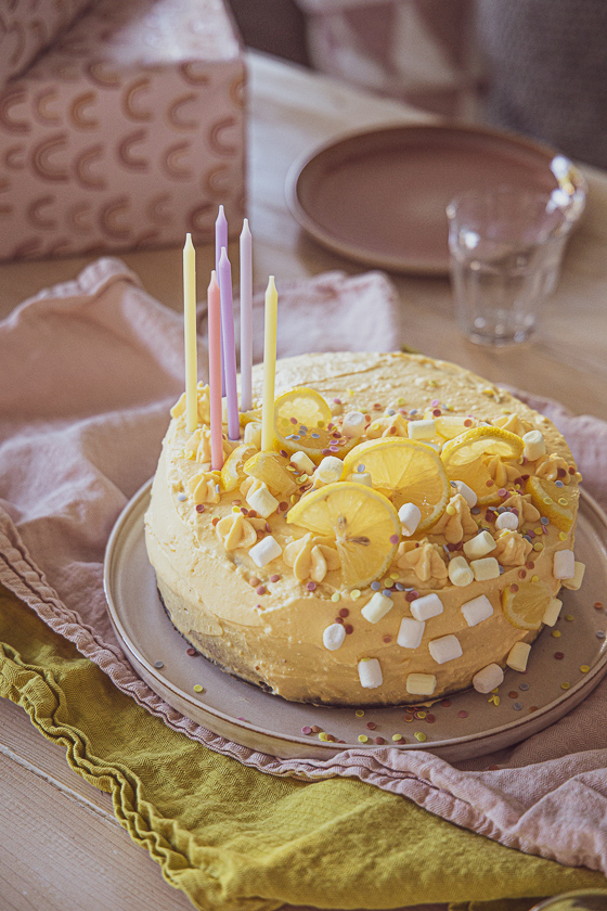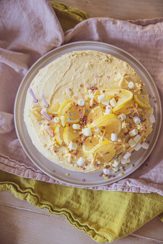 - 3-4 EL der Creme in eine Spritztülle füllen und auf einer Kreishälfte der Torte unregelmäßig kleine „Tuffs“ aufsetzen. Dazwischen, die in sich gedrehten Zitronenscheiben, verteilen, mit Dekorkonfetti und Mini-Marshmallows bestreuen. Ein paar der Marshmallows und Zitronenscheibenviertel kann man an der Tortenseite anbringen. Diese etwas andrücken. Torte am besten über Nacht, abgedeckt kühl stellen.