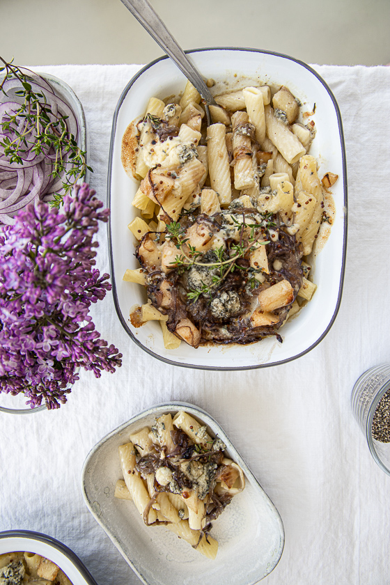 Ich dachte mir, so überbackene Makkaroni mit Blauschimmelkäse, Zwiebeln und Äpfel, gewürzt mit groben Senf, könnten jetzt nicht besser in Jahreszeit passen. Nach einem langen Spaziergang am Nachmittag, an dem die Sonne noch stark ist, und abends wenn man dann das erste Mal den Kamin einheizt oder die Bodenheizung wieder aktiviert. Die ersten Herbsttage, an denen man sich dann doch endlich durchringt, die teuren Hausschuhe aus Schafswolle zu bestellen, der Tee aus der großen Keramiktasse anstelle von Aperol Spritz als Absacker getrunken wird und die Seele mit gutem Essen von innen gewärmt werden muss. Die Blätter draußen tiefviolett wie die roten Zwiebeln werden, die Gräser in den wunderschönsten Brauntönen wie der überbackene Blauschimmelkäse im Wind tanzen und die letzten goldigen Äpfel vom Baum ihren Weg aufs Teller…nein, in die Auflaufform finden. Dann wird es aber wirklich höchste Zeit für dieses Rezept!