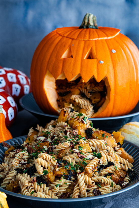 Mein Rezept für den Nudelsalat speienden Halloween-Kürbis findest du bei den Recheis Rezept-Ideen.