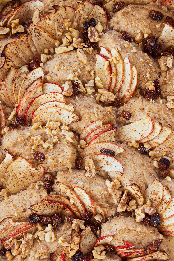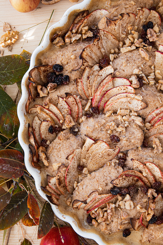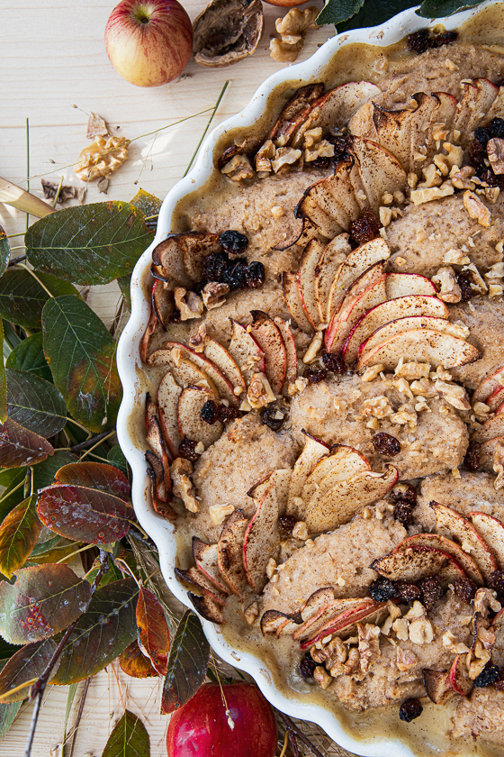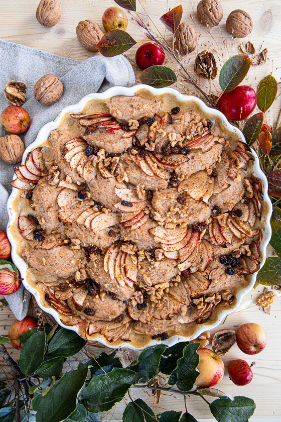 Nun sollte das Gericht allerdings etwas Süßes sein. Somit habe ich mir einen anderen österreichischen Küchenklassiker zum Helfer gemacht – den Scheiterhaufen. Der wird sonst aus Semmeln/Brötchen oder Brotresten hergestellt. Das klein geschnittene Brot darf sich in einer Ei-Milch-Mischung so richtig „betrinken“ und wird anschließend zwischen Apfelscheiben und Rosinen in eine Ofenform geschichtet. Dann noch im Backofen knusprig backen. Man könnte das Brot doch einfach durch süß-flaumige Grießnockerl ersetzen, und schon war das Gericht in meinem Kopf zusammengesponnen.