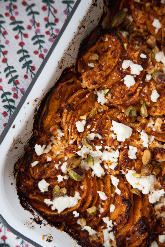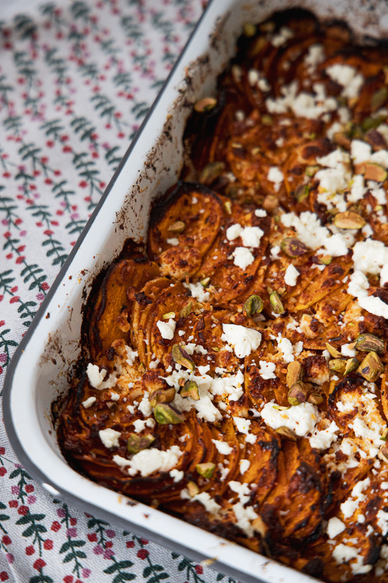- Die marinierten Süßkartoffelscheiben in eine mit Olivenöl eingefettete Auflaufform Reihe für Reihe fächerförmig überlappend legen. Die Marinade aus der Schüssel darüber verteilen und die Hälfte des restlichen Fetas (75 g) darauf geben.