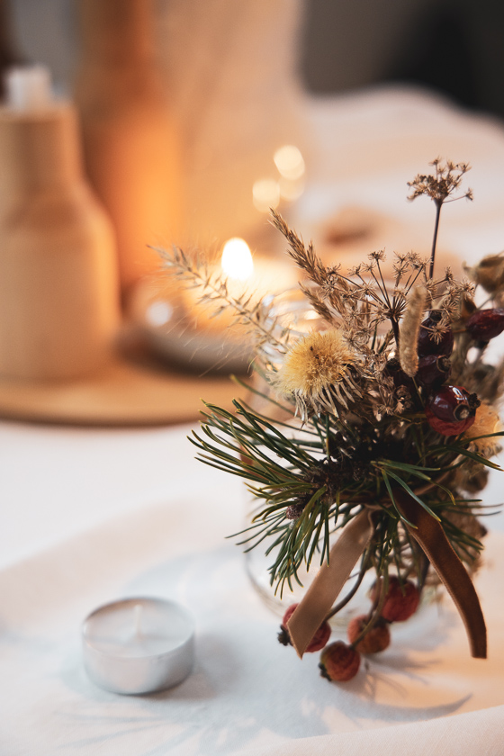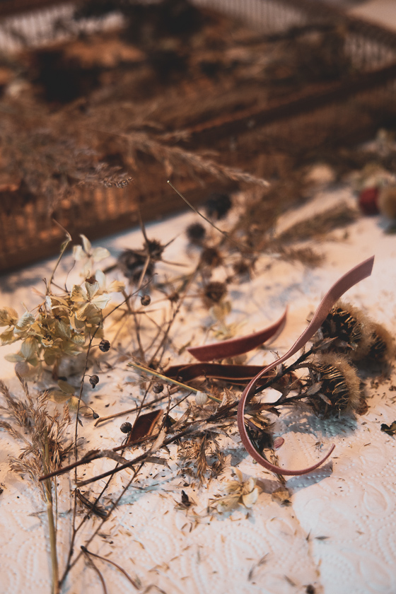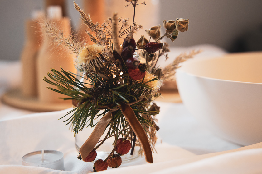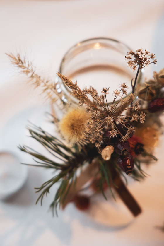 Nach mehreren Corona bedingten Spaziergänge über unseren Hausberg häuften sich Anfang Dezember gesammelte Trockenblütenstände, Gräser und Blätter in einem Korb auf unserem Esstisch. Reisig war auch noch da, vom Adventkranzschüssel schmücken und Hortensienblüten aus dem Garten.