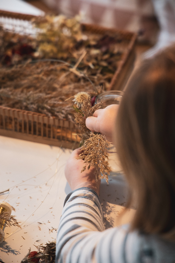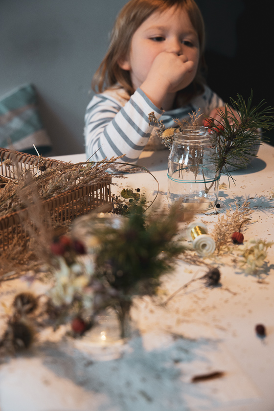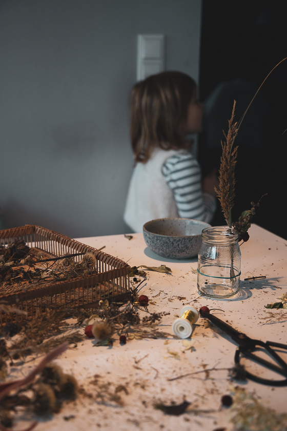 Und Zeit, da war viel Zeit, die nebst zwei großen Homeschooling-Geschwistern überbrückt werden wollte. Und da war eine Mama, die ständig zwischen diesen und einer kleinen, eifrigen Bastlerin hin und her sprintete. Die Lernenden am großen Tisch im Wohnzimmer, die Bastelmaus zwischen Trockenblumenbergen auf ihrem Kinderstuhl am Essplatz. Den einen sollte ich bei spitzen versus stumpfen Winkeln unter die Arme greifen, der anderen Bänder gegen Gläser drücken, damit bereits arrangierte Trockenblumen an Windglas nicht wieder flöten gingen.