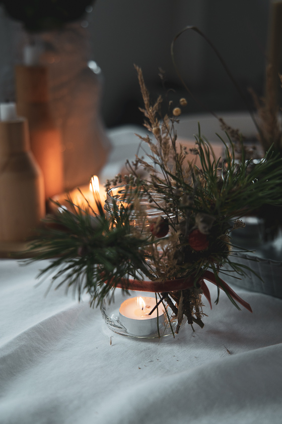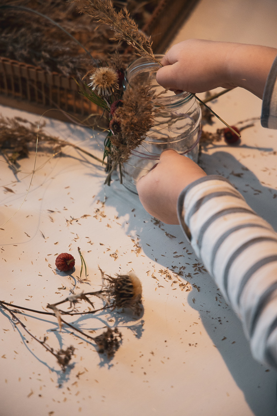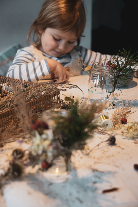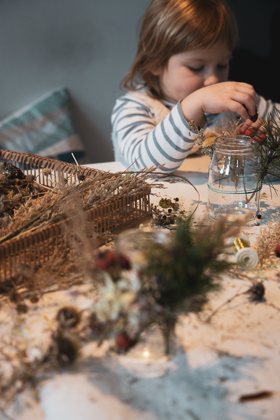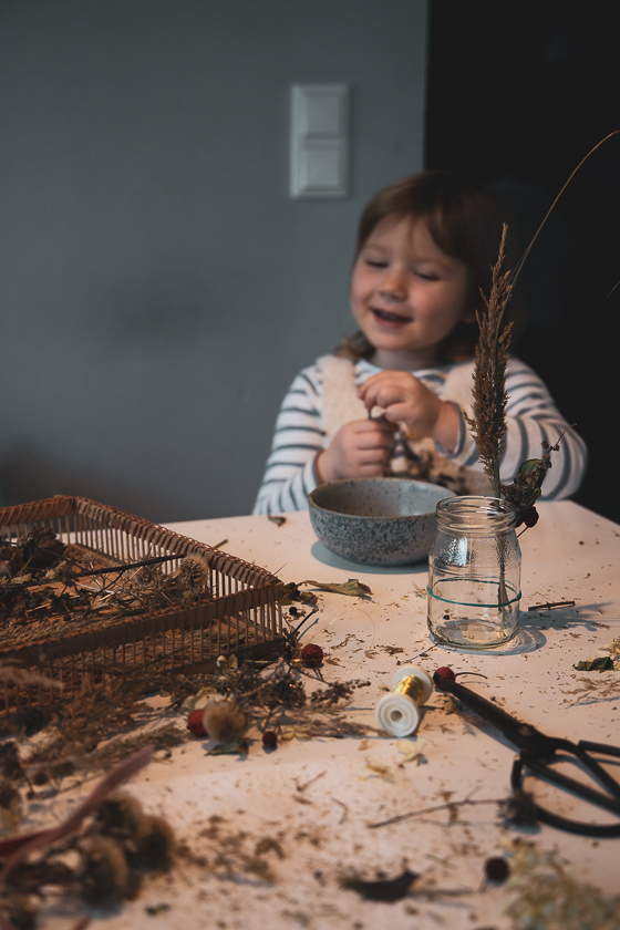 Irgendwann reichte es der sprintenden Mama und mir kam eine Eingebung. „Gummiringerl“ oder Gummibänder, damit hier auch alle Bescheid wissen. Dieses Gummiband wurde kurzerhand zwei Mal um das Glas gezogen und nun konnte die Mini ganz ohne Mamas helfende Hände getrocknetes Grünzeug und Reisig an der Windglasaußenwand verteilen – und dabei noch Kekse knabbern. Ich musste dann nur noch ein wenig beim gleichmäßigen Arrangieren und Samtband binden zum Verdecken des Gummiringerls am Glas helfen. Ja, und ein paar Bilder mit er Kamera gingen sich dank der Gummiringerl-Aktion auch noch aus!